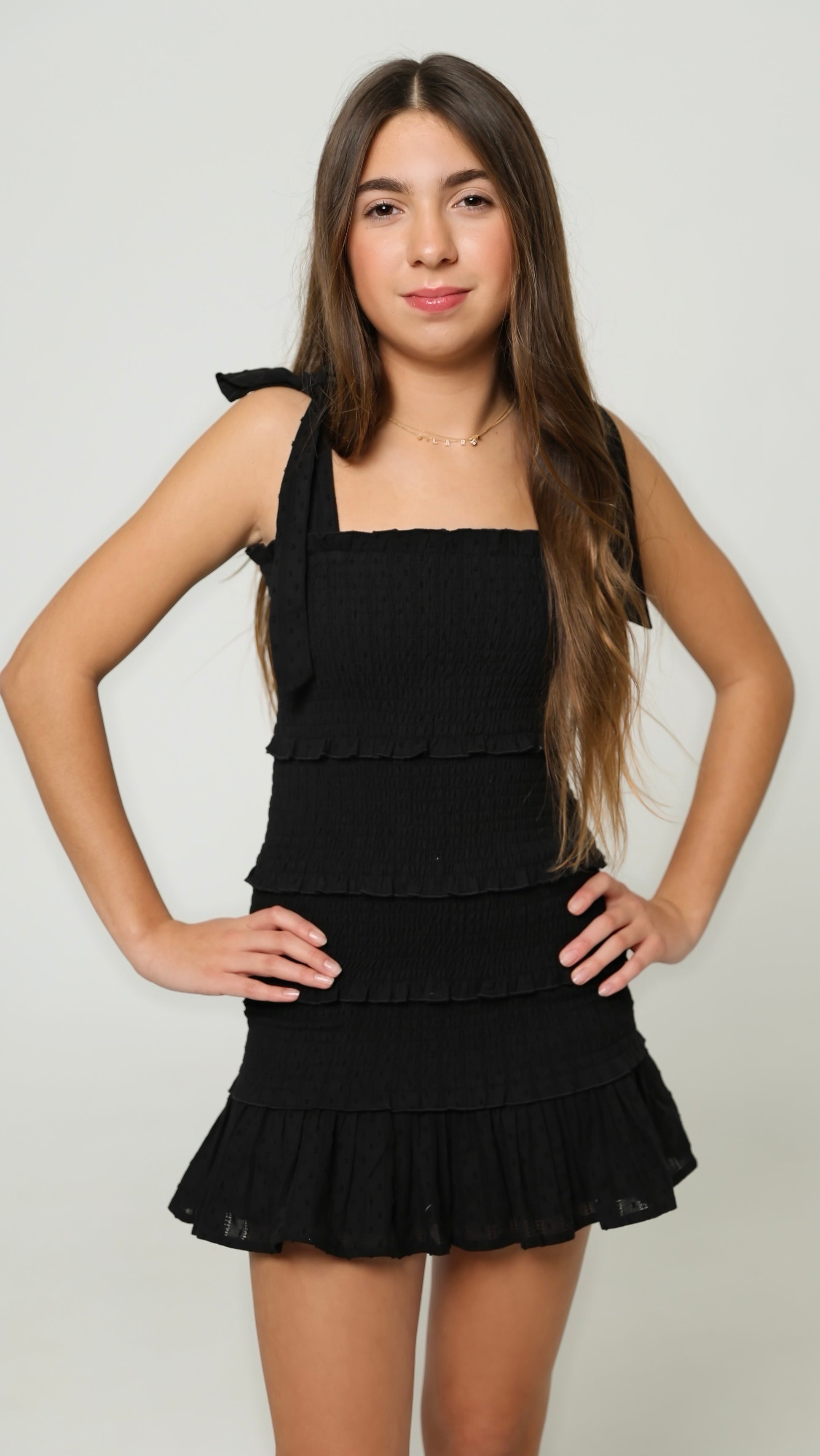 The Reine dress features square neckline adjustable self-tie straps for a perfect fit. The dress is adorned with allover elasticized smocked detailing, ensuring both comfort and style. The design is enhanced with tiered ruffle details and a playful ruffled hem, making it an adorable and fun addition to any young girl's wardrobe