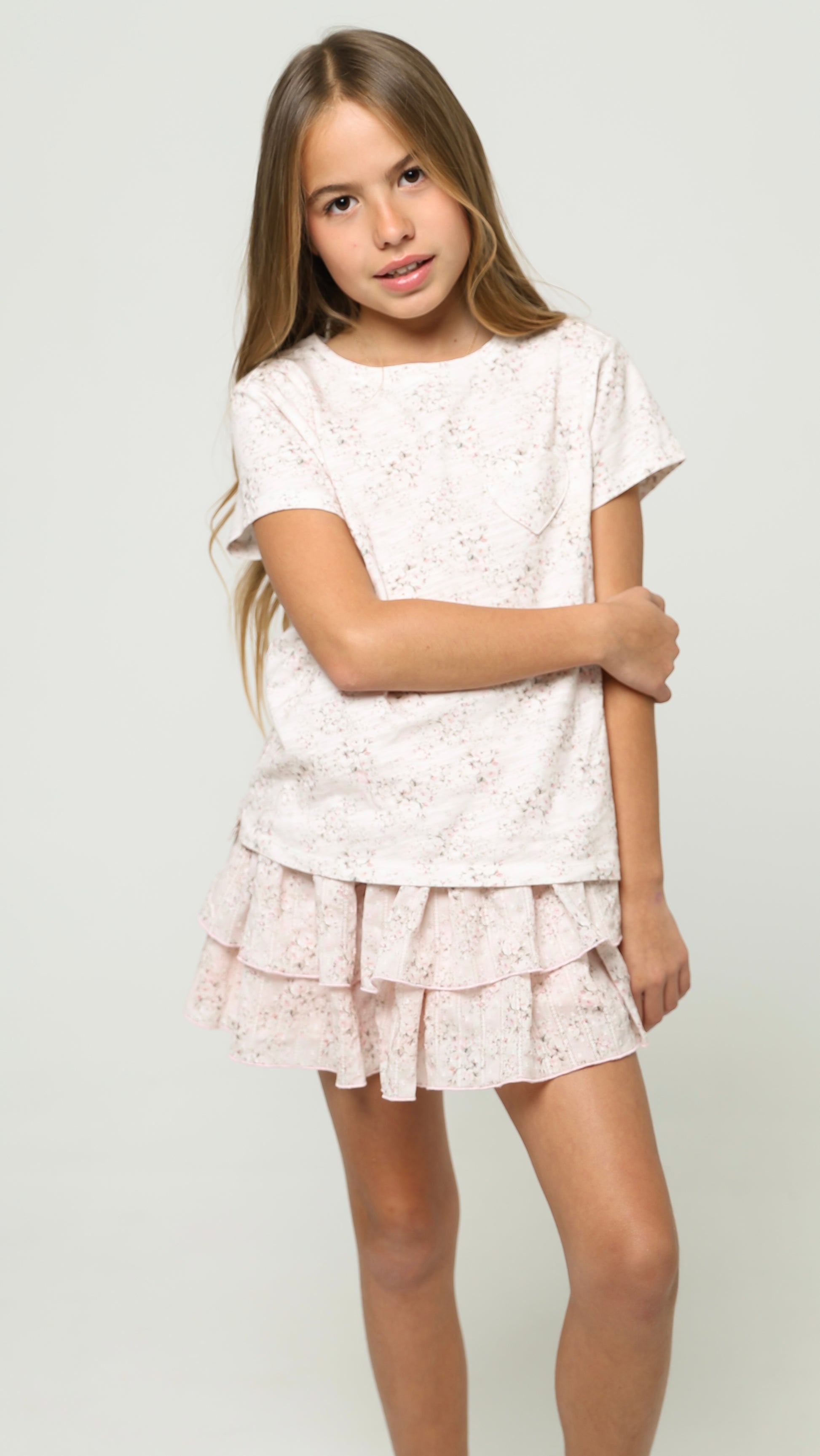 Effortless and sweet, this floral tee is crafted from ultra-soft cotton with a relaxed fit. Its soft pastel blooms make it perfect for pairing with our ruffle skirts